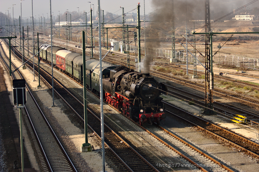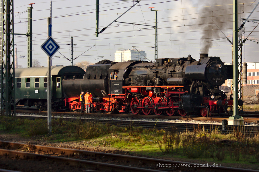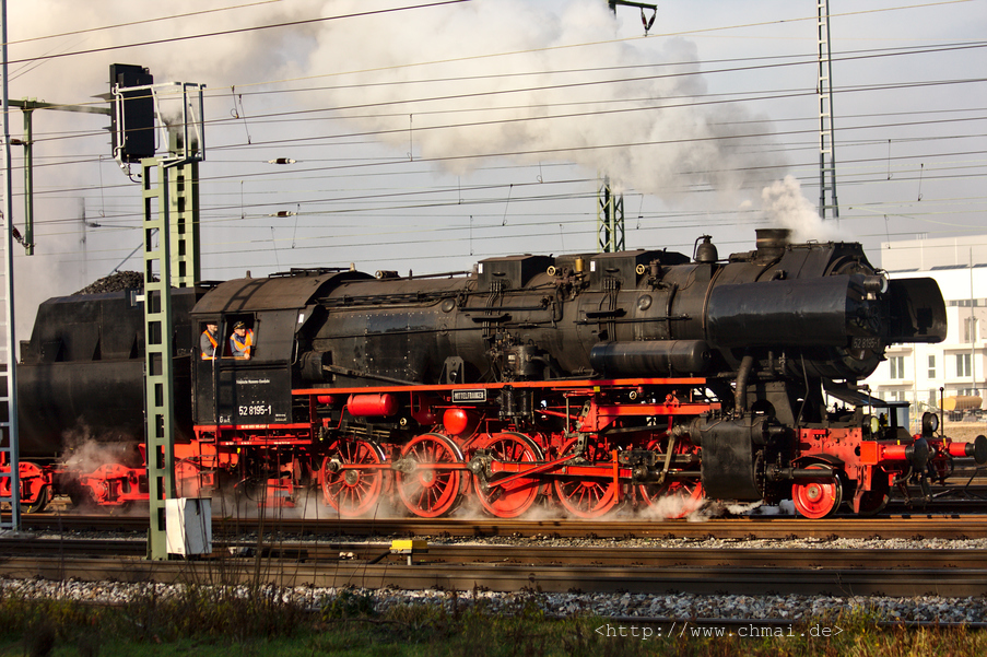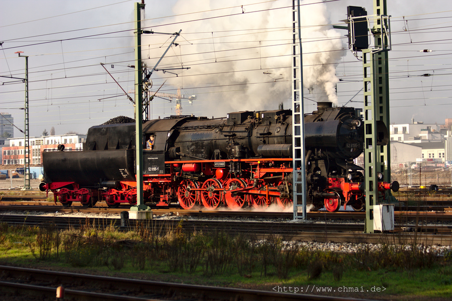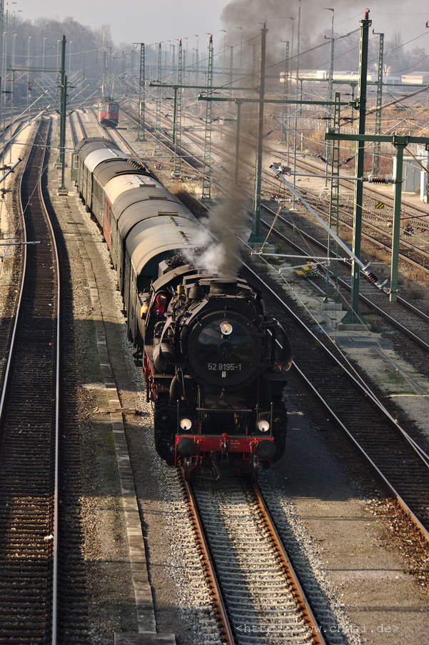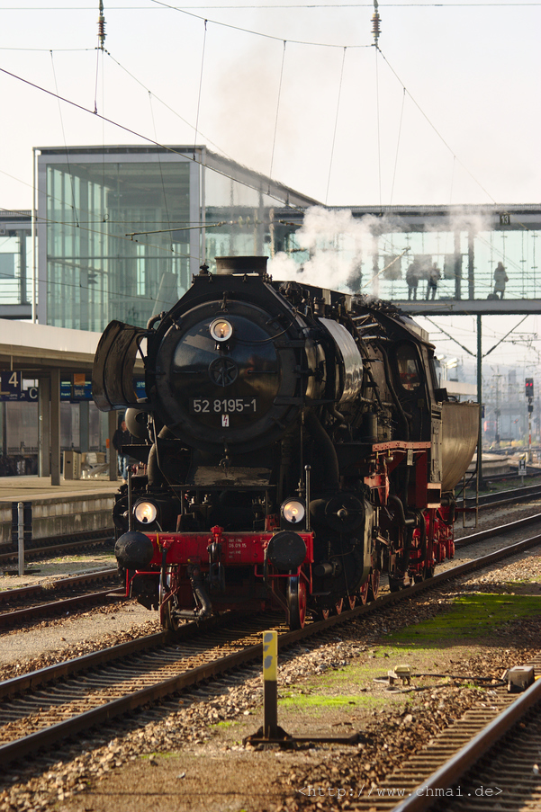 Am 05.12.2015 veranstaltete der Verein Fränkische Museums-Eisenbahn e.V. Nürnberg eine Nikolaus-Dampfzug-Fahrt mit der vereinseigenen Dampflok 52 8195-1. Ziel waren die zahlreichen Weihnachtsmärkte in Regensburg. Und weil Dampfloks ein wunderbares Fotomotiv sind, hab ich die Gelegenheit genutzt und ein paar Fotos gemacht.