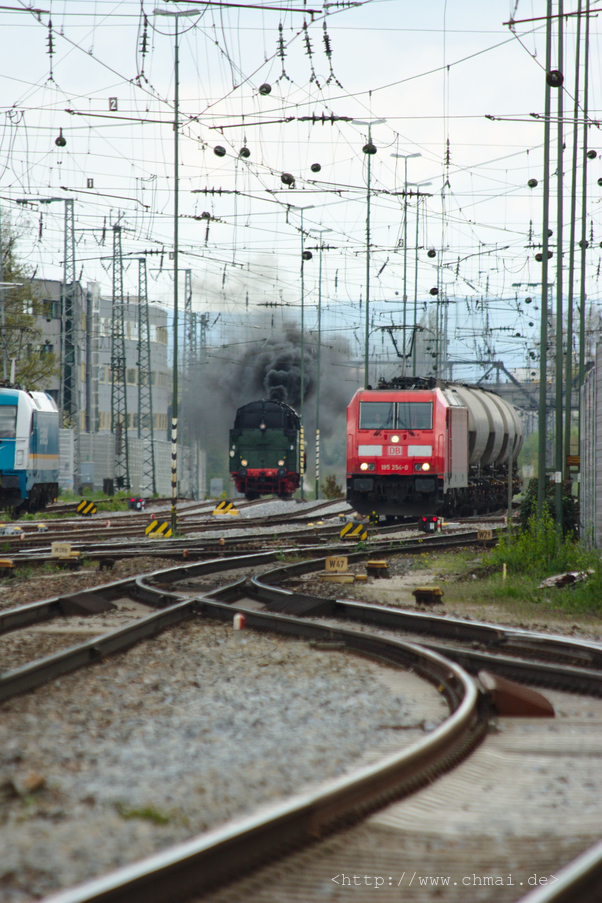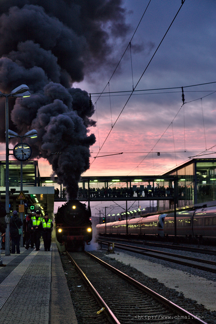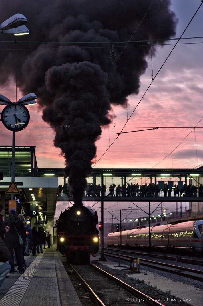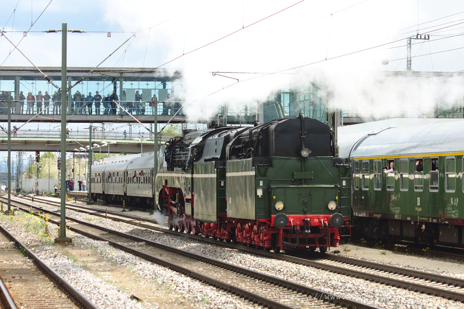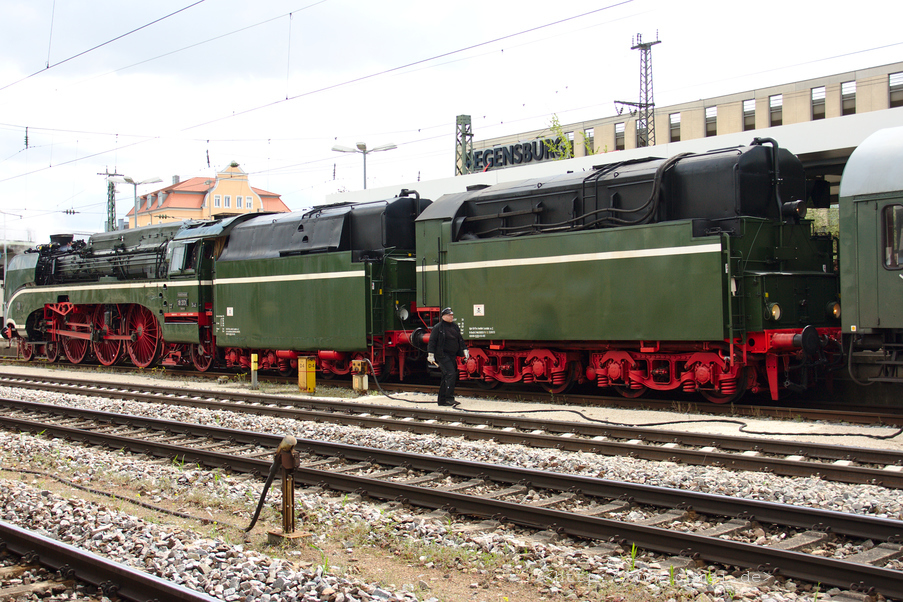 Letzten Samstag hab ich zufällig ein Dampflok bei der Einfahrt in den Bahnhof Regensburg gehört. Nach einer kurzen Suche im Netz war klar, dass ein Dampf-Sonderzug von Nürnberg über Regensburg nach Hof unterwegs war. Anlass war das Jubiläum des letzten planmäßigen Personenzuges mit einer Dampflok von Regensburg nach Hof am 29. September 1973. Und da der Zug in Regensburg noch 20 Minuten Aufenthalt hatte, hab ich schnell meine Kamera gepackt und bin zum Bahnhof.