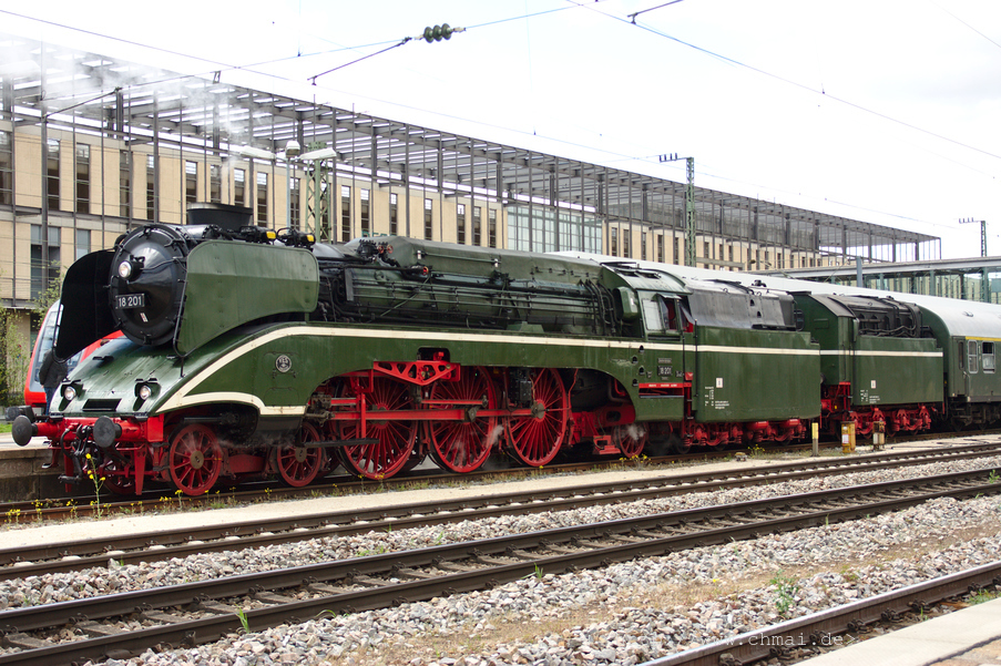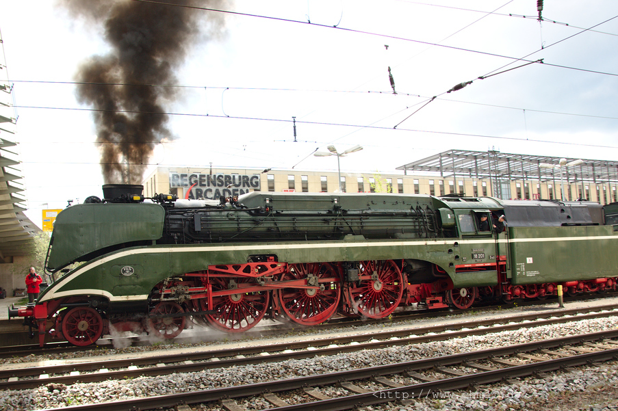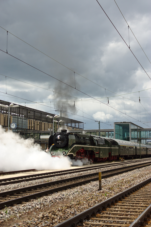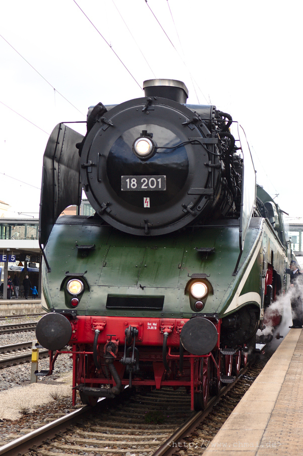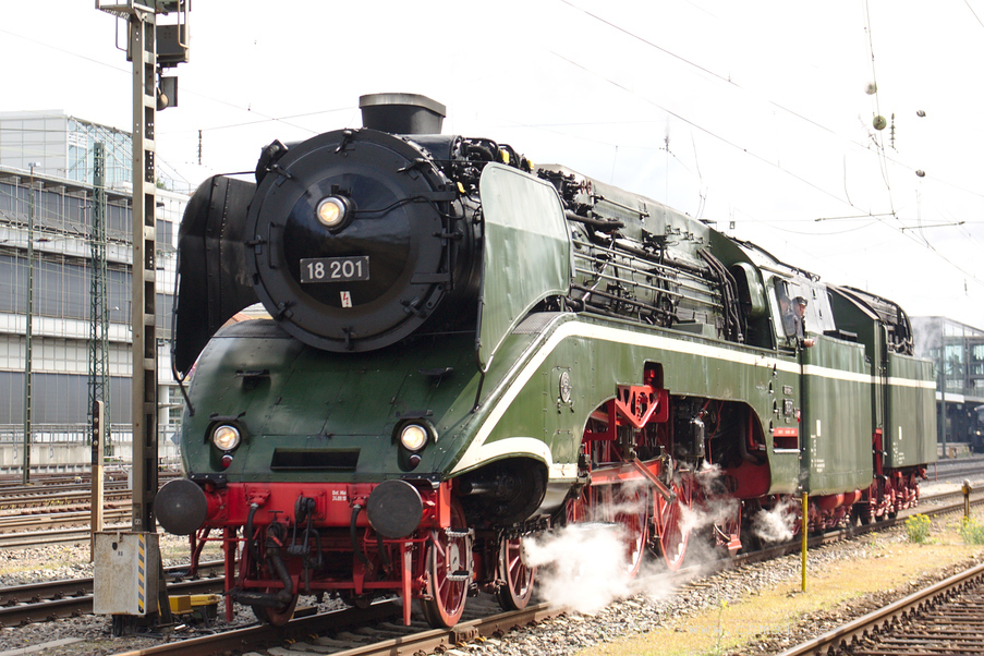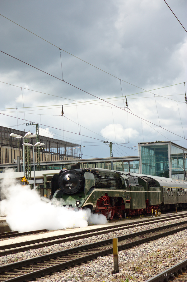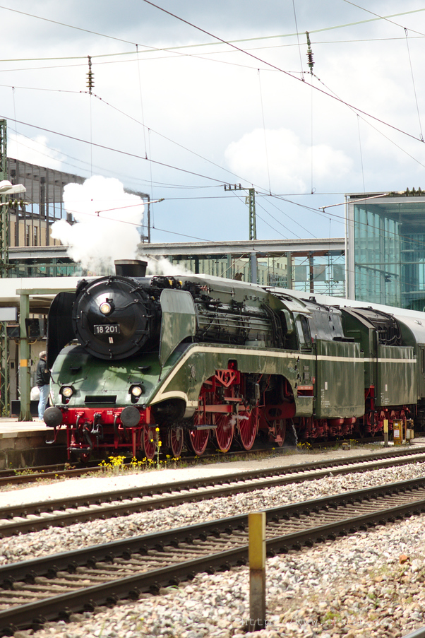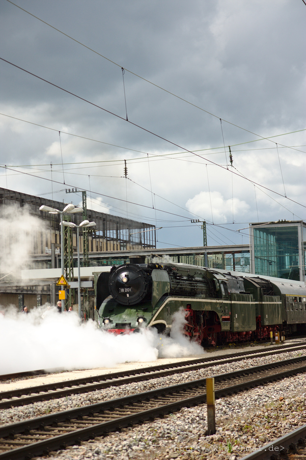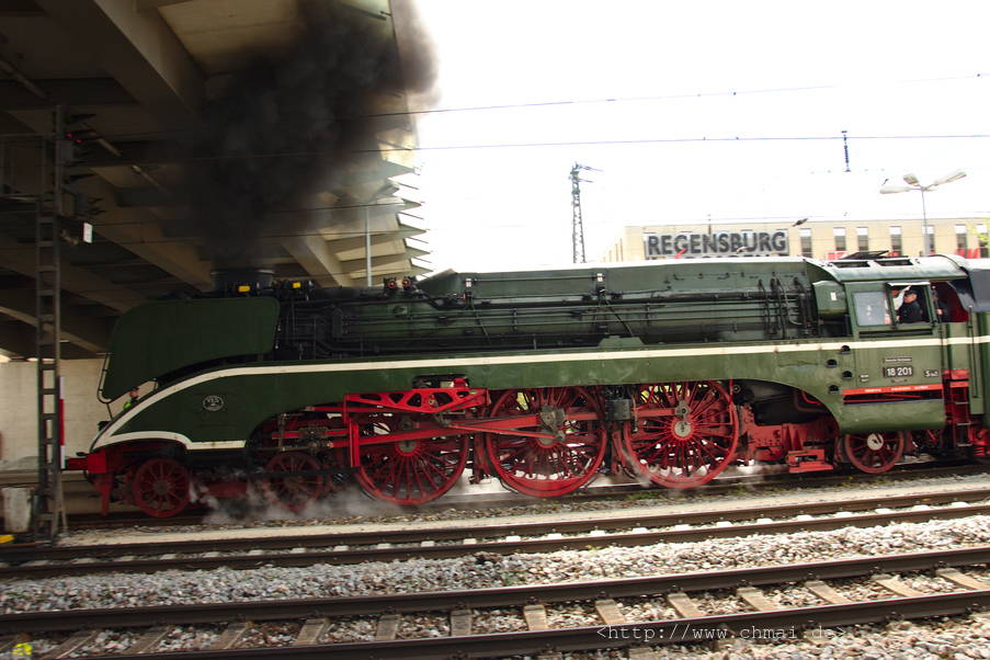 Heute war die schnellste, betriebsfähige Dampflok der Welt in Regensburg: Die Lok mit der Nummer 18 201 war bei einer Sonderfahrt im Rahmen der Hof-Plauener Dampftage morgens in Hof gestartet, Ziel war Regensburg. Ich hab nur zufällig das Pfeifen der Lok gehört, als ich gerade zum Bäcker radeln wollte. Also kein Frühstück, Kamera gepackt und ab zum Bahnhof. Hier ein paar Bilder.