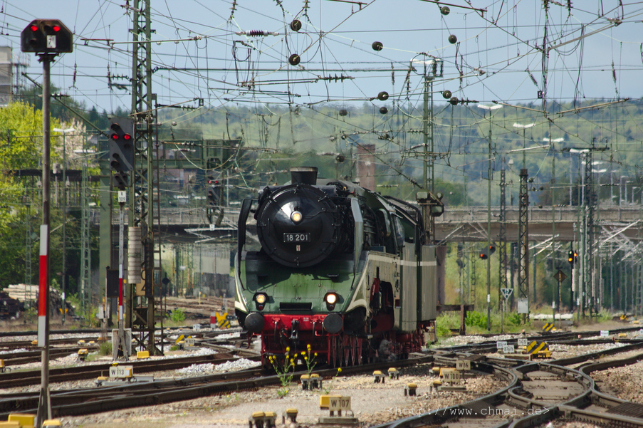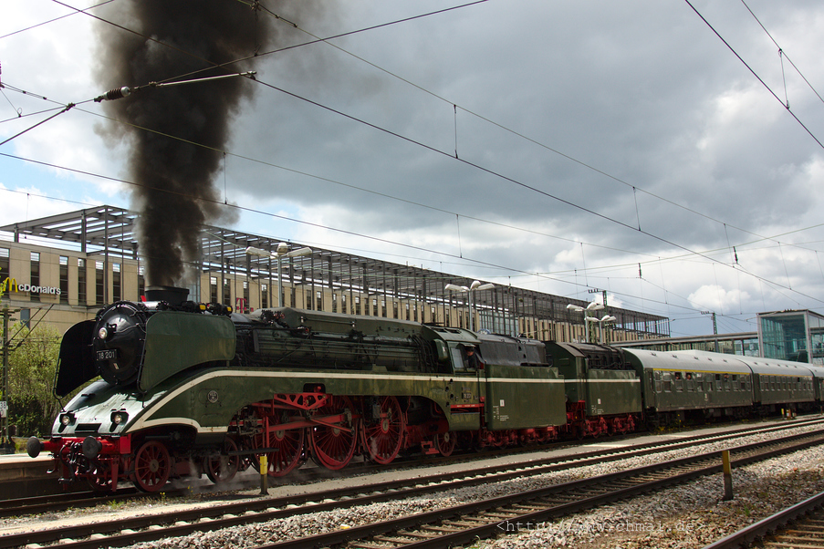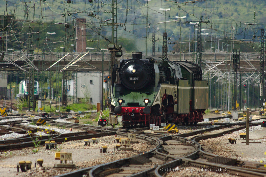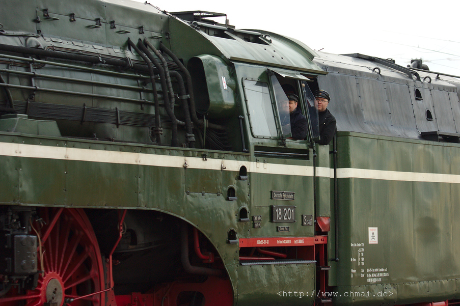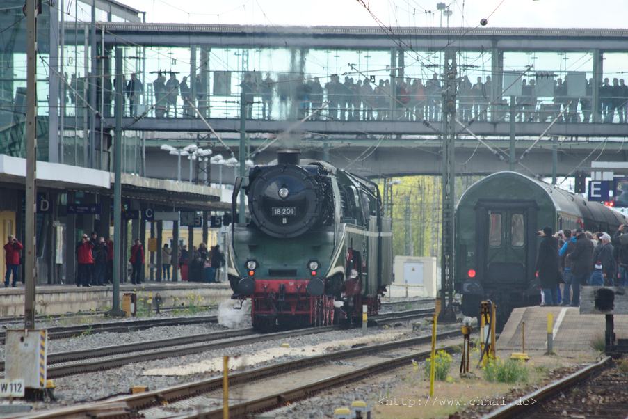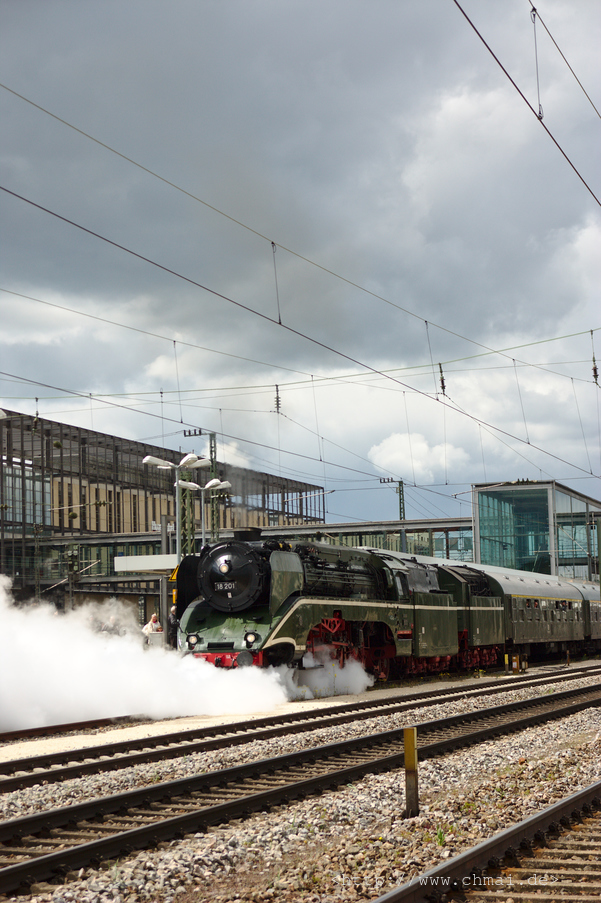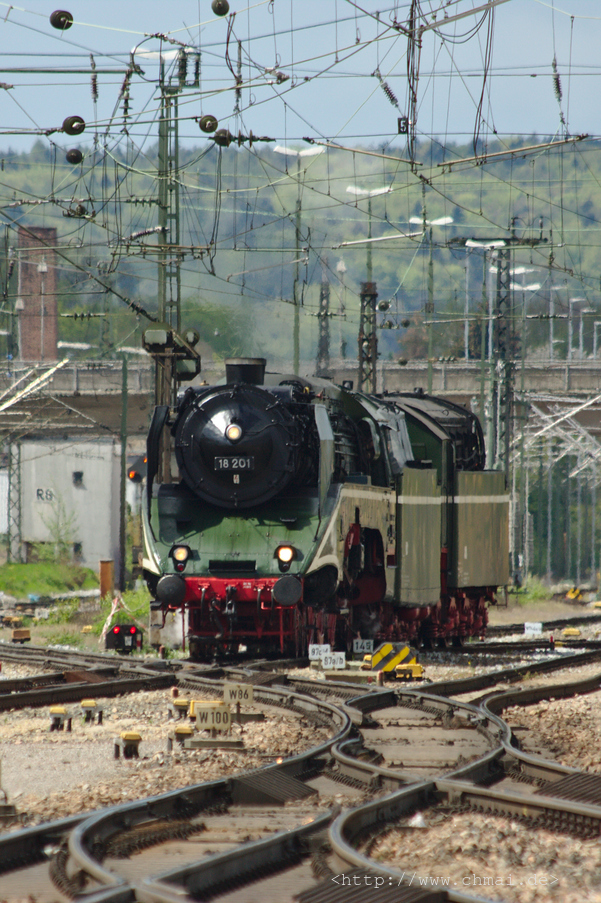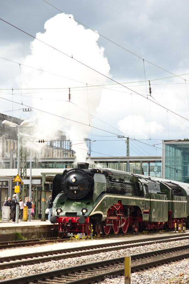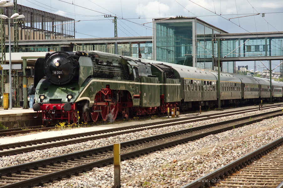 Heute war die schnellste, betriebsfähige Dampflok der Welt in Regensburg: Die Lok mit der Nummer 18 201 war bei einer Sonderfahrt im Rahmen der Hof-Plauener Dampftage morgens in Hof gestartet, Ziel war Regensburg. Ich hab nur zufällig das Pfeifen der Lok gehört, als ich gerade zum Bäcker radeln wollte. Also kein Frühstück, Kamera gepackt und ab zum Bahnhof. Hier ein paar Bilder.