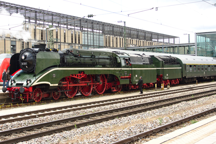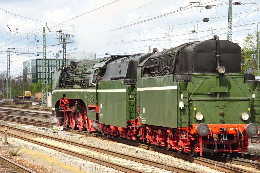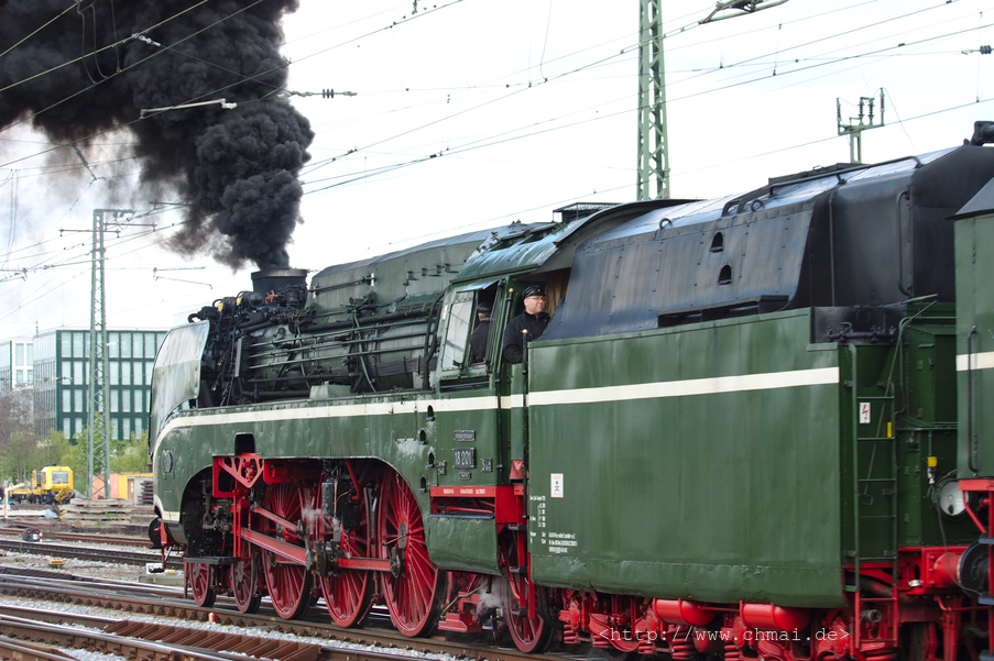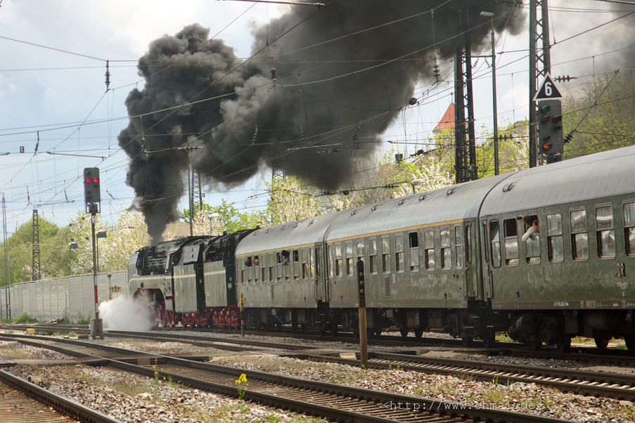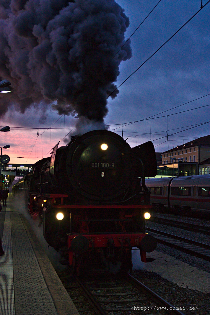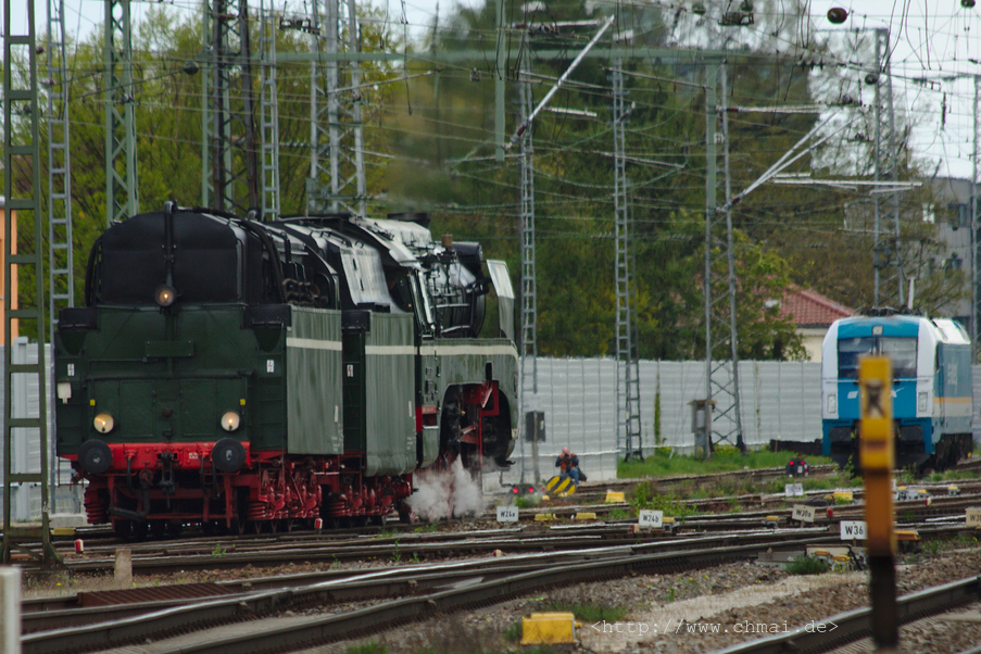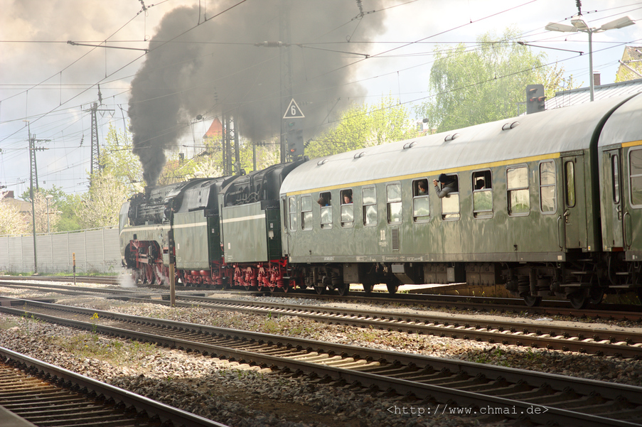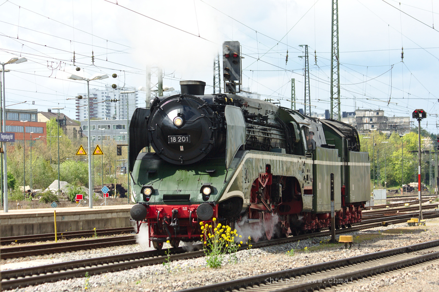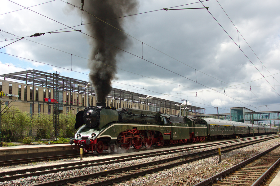 Heute war die schnellste, betriebsfähige Dampflok der Welt in Regensburg: Die Lok mit der Nummer 18 201 war bei einer Sonderfahrt im Rahmen der Hof-Plauener Dampftage morgens in Hof gestartet, Ziel war Regensburg. Ich hab nur zufällig das Pfeifen der Lok gehört, als ich gerade zum Bäcker radeln wollte. Also kein Frühstück, Kamera gepackt und ab zum Bahnhof. Hier ein paar Bilder.